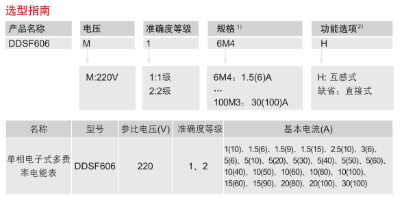 如客戶(hù)需要DDSF606型單相電子式多費(fèi)率電能表,電壓為220V,準(zhǔn)確度等級(jí)為1,電流規(guī)格為1.5(6)A,則相對(duì)應(yīng)的訂貨編碼為:DDSF606M16M4H